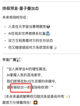 不过这里要分享的是 deepseek-r1 这几天最震惊我的地方, 它的幽默感也太棒了, 又高级又机智又 bt 又合理...... 在幽默感上也完全通过了我的图灵测试. 这里引用一些最有趣的生成内容截图: