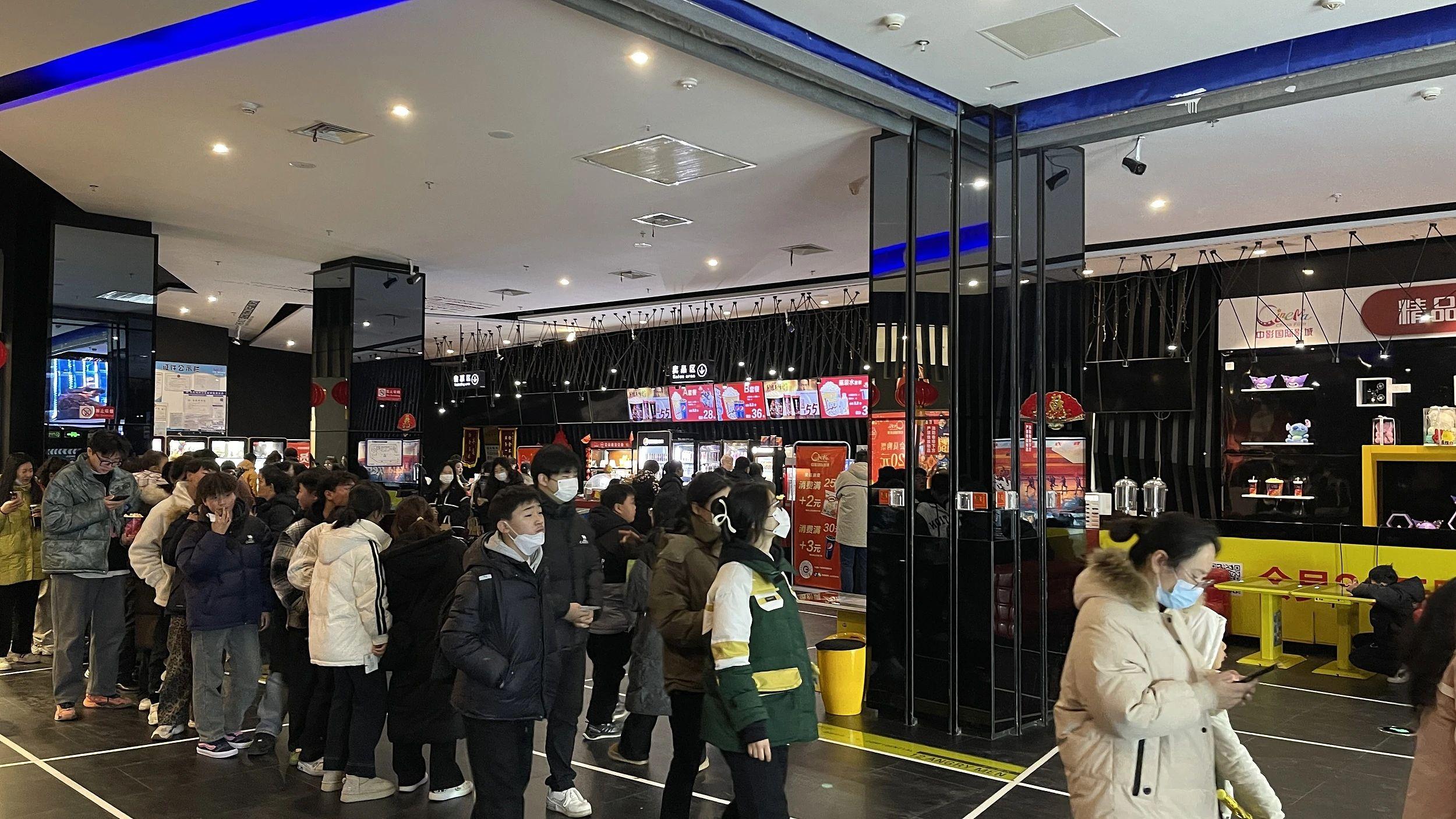 在不停摇晃、旋转的镜头里,买爆米花、买票、等待进场的人都排成长队,影院的角落都坐满了人。拍视频的观众说,“这商场都倒闭完了,该倒闭的电影院又繁华了一波”。