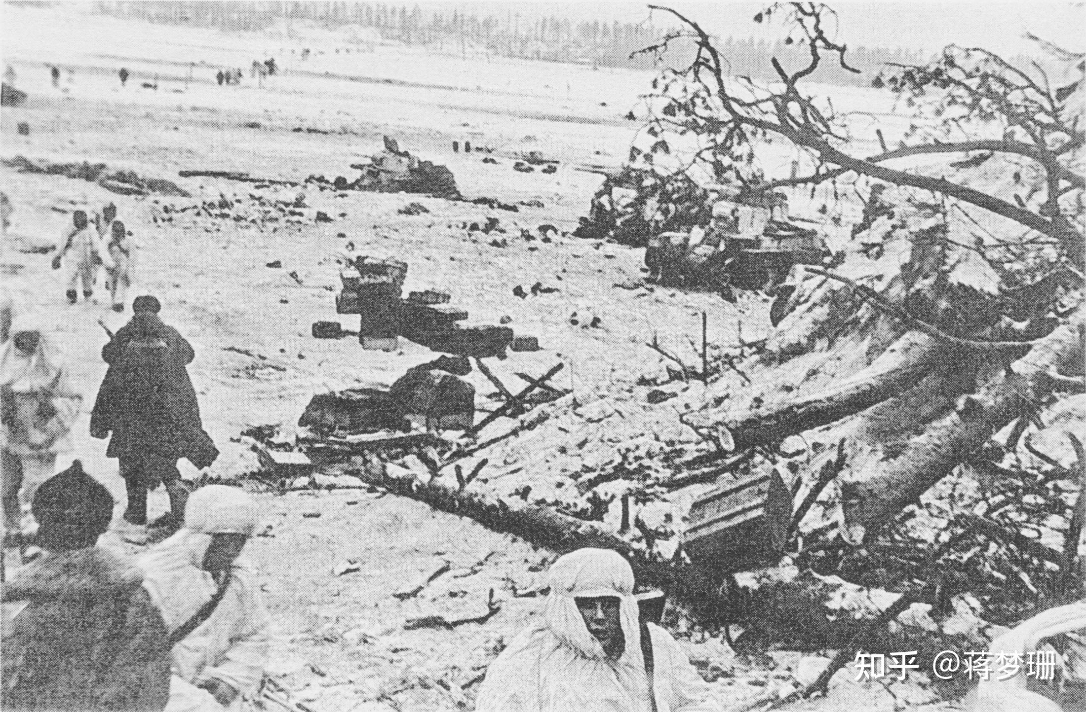 - 在夺取涅瓦河左岸桥头堡后,为保障人员补给与渡河,修建了由圆木嵌入冰面再上冻加固的冰上通道。此外,还专门铺设了承载T-34等中重型坦克的高强度通道。占领左岸后,BT系列、T-60、T-70轻型坦克及BA-10装甲车组成的轻坦旅被迅速调往前线,支援步兵部队。照片可能拍摄于行动首日,当时通道尚未完全建成。图中清晰可见冰面上的标志杆。据记载,此类标志用于标记冰面破损区域与冰窟,但从照片判断,它们更可能标示人行通道。