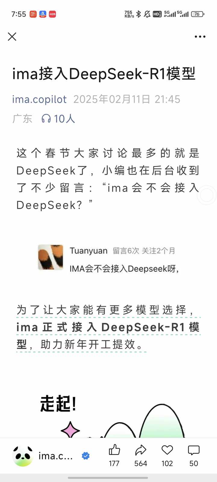 腾讯的ima.copilot已经接入deepseek了,大家可以试试,我自己试用了一下