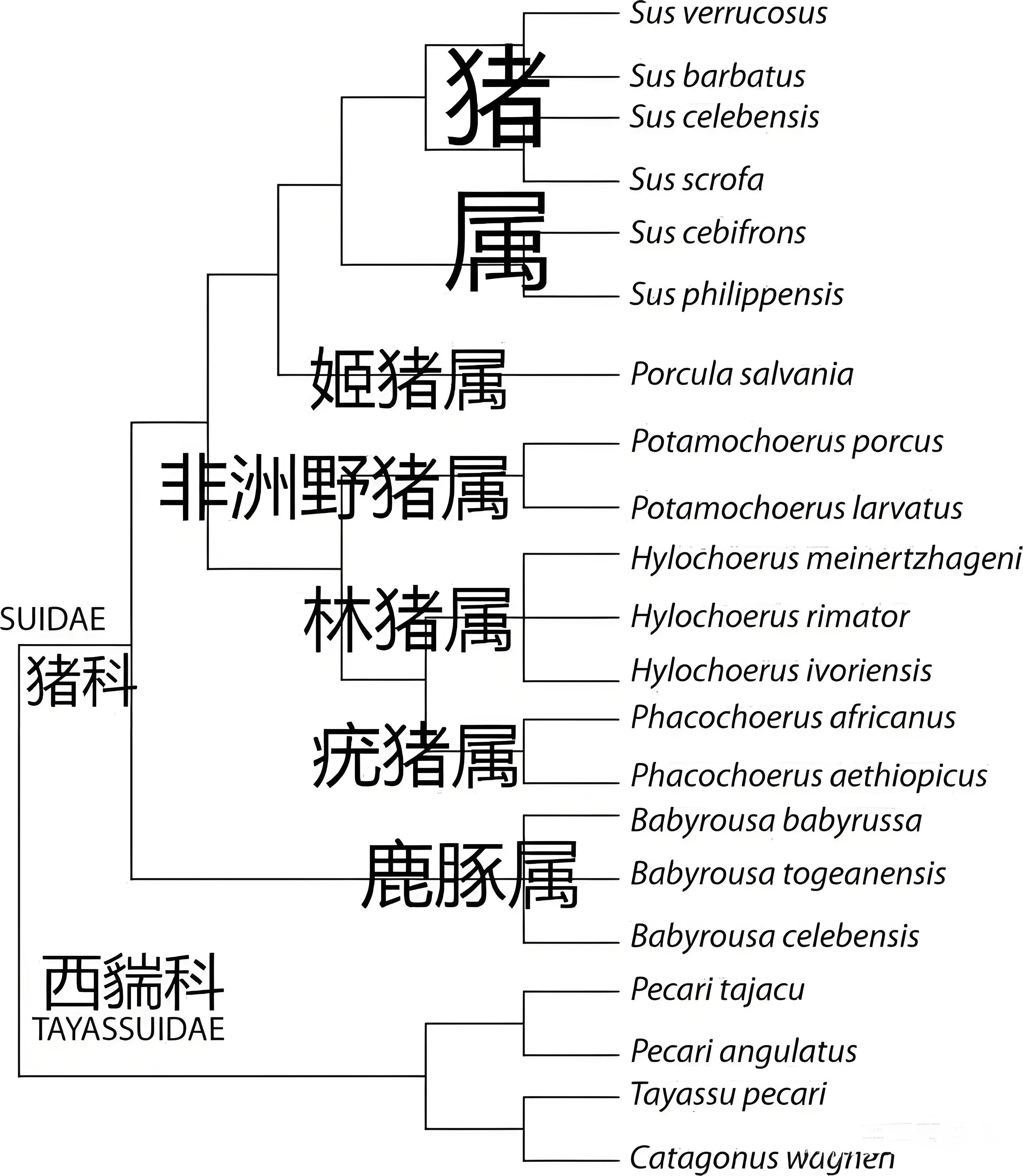 西猯和猪在进化树上距离很远。它们的共同祖先可以追溯到几千万年前。[1]