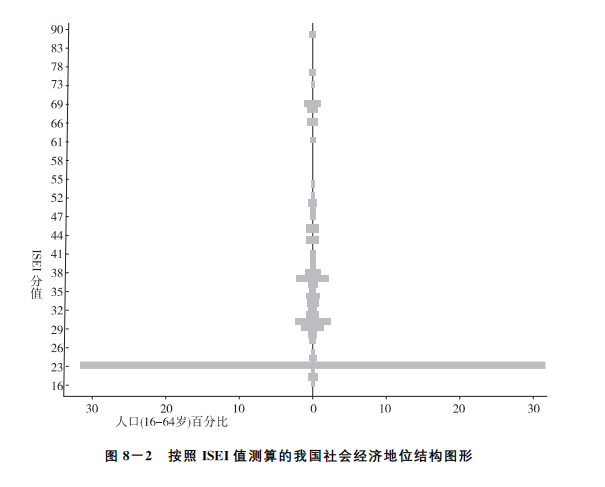 2005年清华大学李强教授采用 「国际社会经济地位指数」的方法,对我国 「第五次全国人口普查」数据进行分析,提出了「倒丁字型结构」。发现我国基本社会结构比一般金字塔的结构还要差,可以说是倒丁字形的,或者说图钉型社会,即这个大头钉的钉面是大家基本解决了温饱问题,钉杆是所谓的一部分先富起来的人,钉尖是超级富豪(超级富豪又和中国的权力集团扭结在一起)。64.7%的人处在非常低的分值位置上,与其他群体形成鲜明的分界,其他群体则像一个立柱,显示了巨大的差异性。第23分组占了全部就业者的63.2%,其中大部分为传统意义上的农民。根据中国近年的财富分化趋势,这个结构不会变好多少。