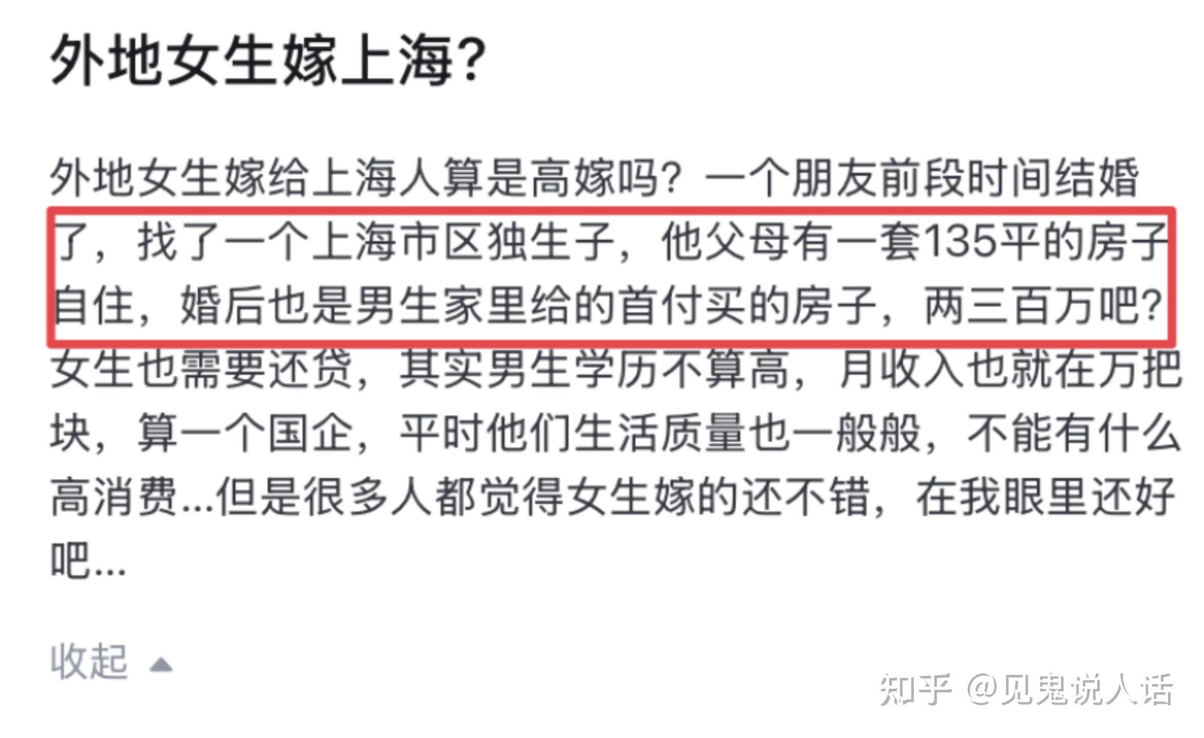 那你那朋友什么条件你也不提,估计和大多外地人一样,靠自己大概率无法在上海扎根!从房子面积来看她嫁的家庭看情况大概率00左右第一代新上海人家庭,那会时代红利还在。还有现在300万房子要么就是市区老破小,要么郊区远大新,应该离男方父母家挺远。至于这段婚姻也不怎么看好,雷太多,不方便的地方也不少。