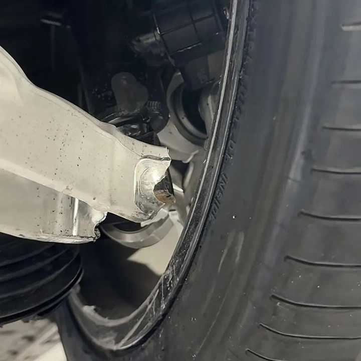 行至某一破损/坑洼路面,因前述不当驾驶行为,车身部位冲击凹坑边缘,导致车辆右后侧轮胎、轮毂、悬架等部位在冲击后受损。