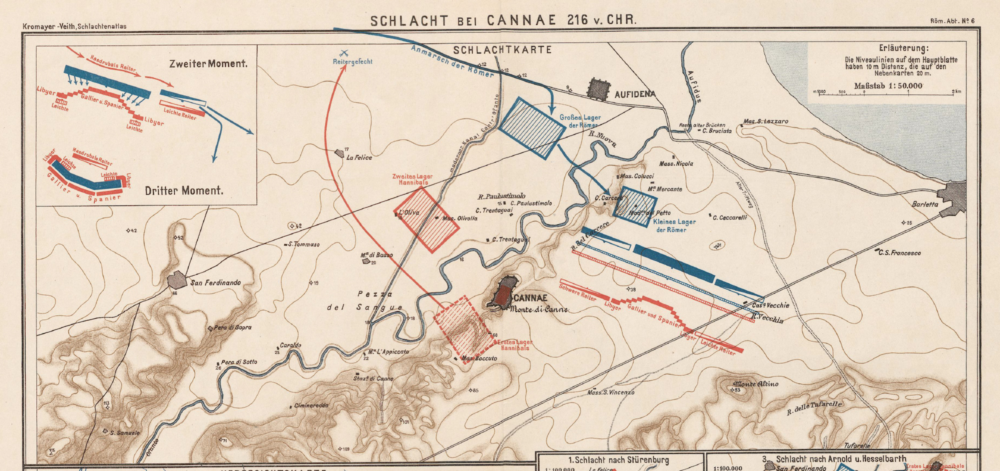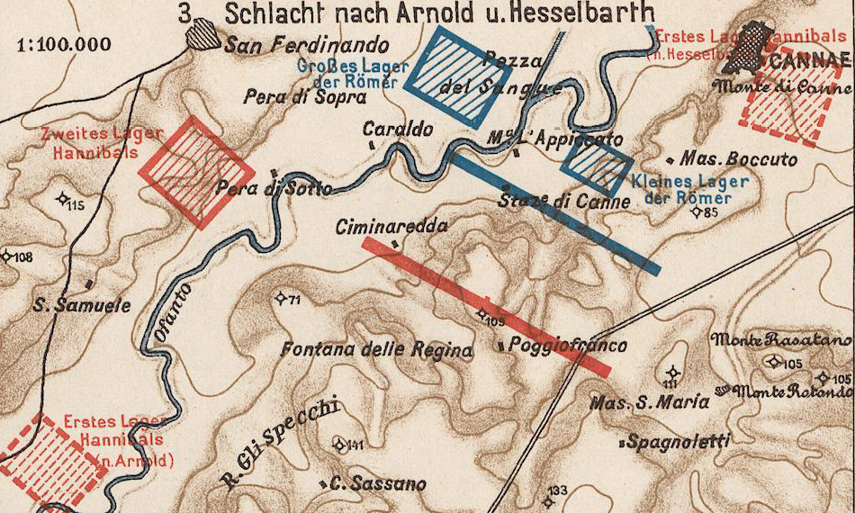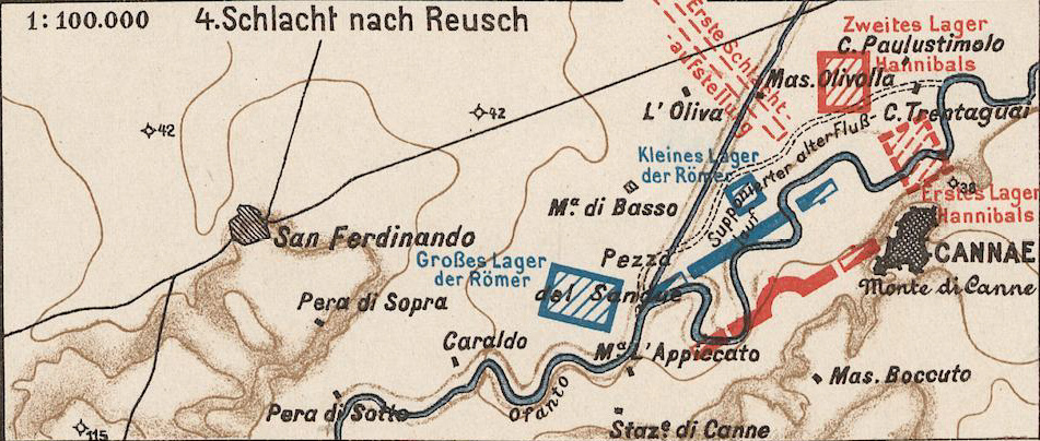那时,随着测绘技术的进步,人们已经能够充分掌握坎尼战场附近的地形。然而,在1922年出版的克罗迈尔-法伊特(Kromayer-Veith)版古战地图集里,除了他们认为较为合理的在坎尼下游、从左岸转移到右岸决战的大图外。