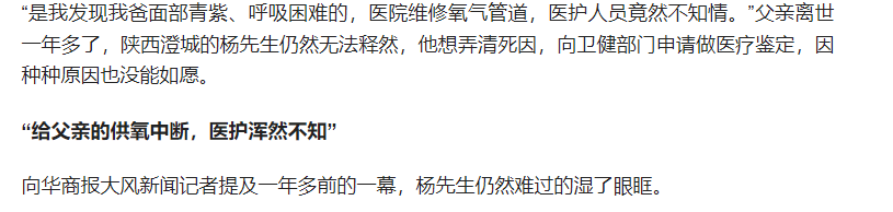 家属描述的事件顺序是这样:父亲因肺癌入住陕西省渭南市澄城县中医医院康复科,10月26日中午,出现面部发紫,呼吸困难,家属诉患者本人表示:没氧气了