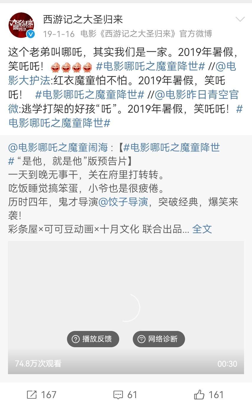 想起前些年动画电影不甚受到关注,动画电影圈自成一体的时候 。当时每一部动画电影上映的时候,宣发期间,其他电影官博都会自发积极转发,即便官博没几个粉丝。很多还会出联动漫画或者动画。哪吒1上映时,《大圣归来》《白蛇缘起》《大护法》等官博都积极地发,我记得当时大家就在说,动画电影都希望把自己最硬的龙鳞给哪吒,助他在电影界闯出一片天。在哪吒票房到了五十亿,各官博更是兴高采烈祝贺,与有荣焉。