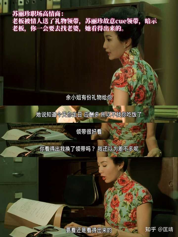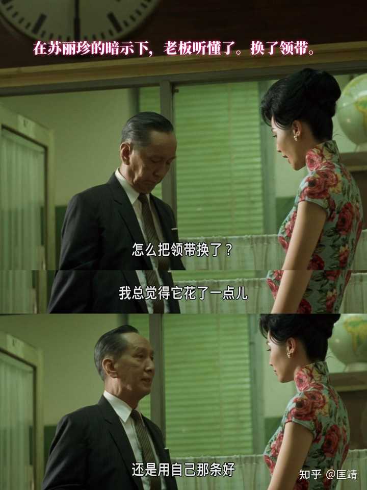 后面,领导生日这天(领导一会下了班要去找老婆吃生日宴),苏丽珍转交情人送的礼物给老板,马上躲出去冲咖啡,给领导私下拆礼物的空间,咖啡冲完回来了,没想到领导直接戴上了情人送的礼物——领带。她直接反手一个暗示:领带很好看哎。领导问:你看的出来啊?答:要看还是看得出来的。