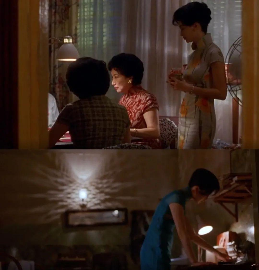 细节2,1963年,新加坡。苏丽珍来到周慕云的房子里,拿走了鞋子,抽了周的香烟。这里有一个苏丽珍的侧面,她穿一袭蓝旗袍,小肚子明显,疑似怀孕的象征。