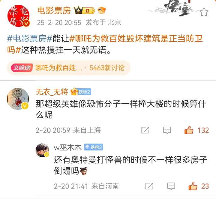 成都地标建筑双子塔为哪吒敖丙亮灯 然后过了十多天哪吒破百亿了,增速正常降下来了,央视直播了、陆陆续续有单位组织开始看了,这下找到机会了,开始用《长津湖》《战狼2》的套路来说刷票房了,不是哥们儿,《长津湖》后期组织观影又暑假重映也没见涨几千万票房,《战狼2》明明是商业类型片赢了同期另一部真主旋律装看不见,《流浪地球2》当初那么多人n刷也没见追上玩下沉的《满江红》,其实这些观影对电影票房大盘数据的影响微乎其微,就是有人双标罢了。