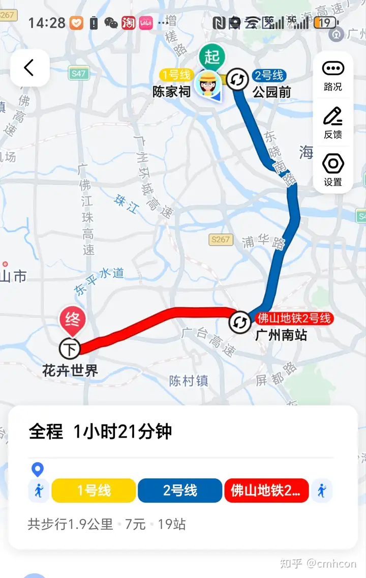 然后我住市区,并非靠近广佛的位置,但每个月至少去两次佛山找饭吃,顺德陈村开车1.5小时,这个距离不回家想不懂,除非卖白粉或欠赌债。公共交通更快,地铁1小时21分,如果7元都算巨款那我无话可说。