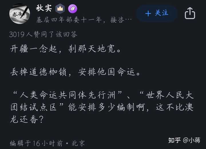 别人关心时政,“中国要收澳大利亚,收台湾”,这就是龌龊的,是底层人思配苦的依据