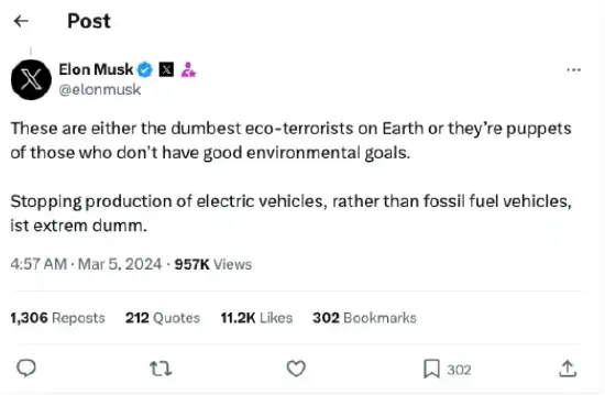 说这帮绿色恐怖主义分子一方面要求用电力汽车取代燃油汽车,另一方面又不允许建设电力汽车工厂,这帮人要干嘛?
