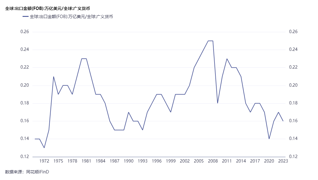 这是全球出口金额与广义货币的比值,相当于一美元的货币能够创造多少美元的出口(0.13美元-0.25美元之间波动)。与康波周期结合,第五轮的康波周期乃是信息技术和全球化共同推动的,因此出口金额的变化比较关键,是判断周期方向的重要指标。