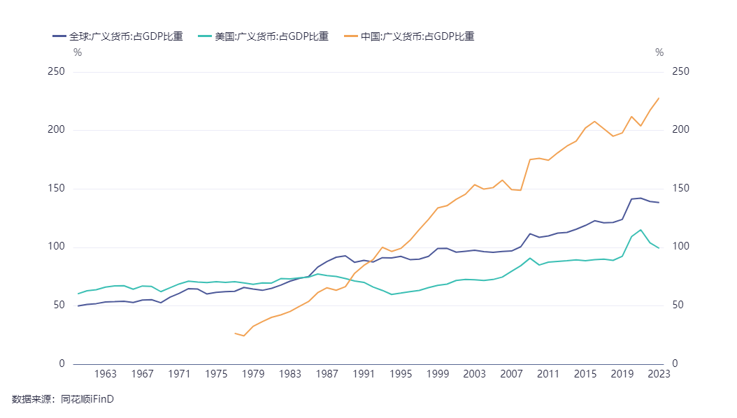 这是中国、美国和全球广义货币占GDP比重的情况,可以看出中国的实力了,强悍到极点,吊打美国和全球,应该给中国颁发MMT理论实践上的诺贝尔奖。