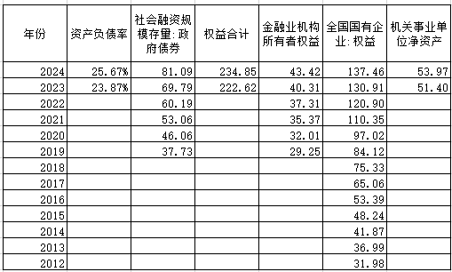 2024年,国家权益(净资产234.85-负债81.09)为153.76万亿,2023年为152.83万亿,这就是不含未开垦资源以及不纳入报表的军队等特殊机构资产的国家总家当。