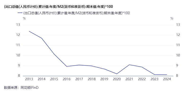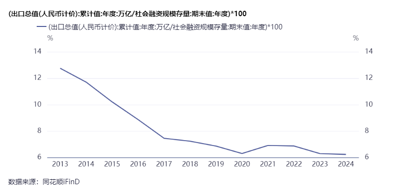 这是中国出口总值除以M2的缺口,也是持续下行中,2024年,一单位人民币创造的出口总值为0.0812,是全球的一半,实际上,我们是社融驱动经济,用社融更加合理: