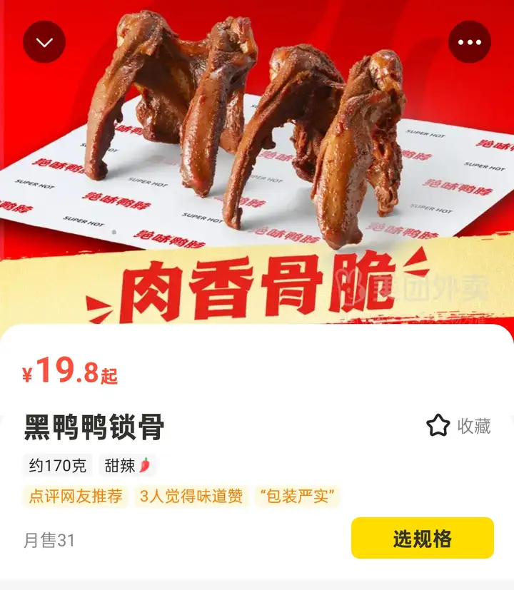 再来看看绝味鸭脖近似规格的价格。170g鸭锁骨要19.8元。