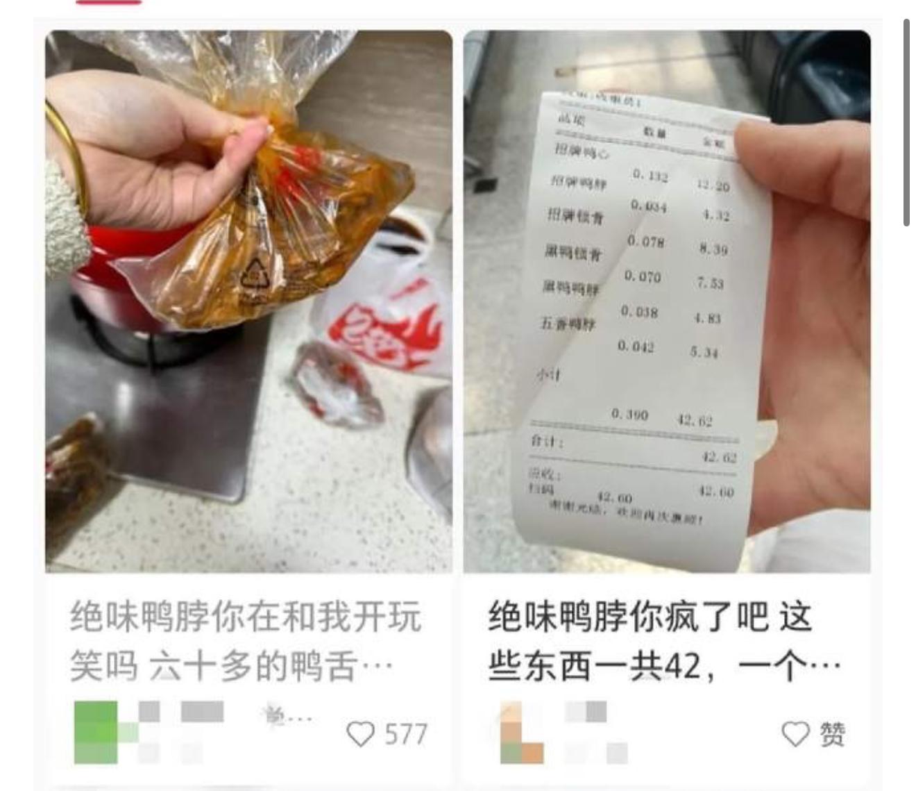 我看了一眼某外卖平台的周黑鸭,40块一盒,顶多两根鸭脖的量 ▲