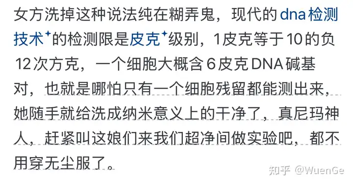 要不然,如果有女性借你家的浴室洗澡,浴室里一定也能检出“你的精斑以及你和女方的混合DNA基因分型”,这能证明你曾经在浴室里强奸她吗?不要问我浴室里为什么会有你的精斑。