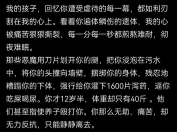 可惜网上信息太少,不然真的很想知道,这个后妈出于什么心态要这样虐待一个小孩。