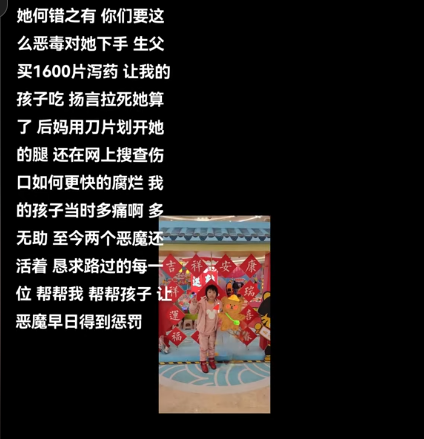 妈妈发的照片里,应该是她4岁左右的时候,还是个阳光灿烂的小孩,没想到最终被折磨的如此悲惨。
