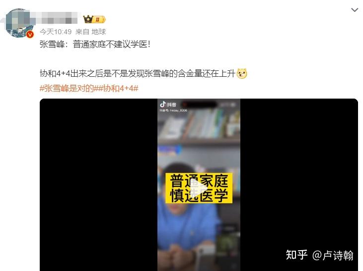 而大量吃瓜群众关注下,很快有人挖掘出了更劲爆的部分,协和4+4相关,作为医学圣堂的协和居然有这种捷径,舆论全面升温。各路博主,医学生,乃至辛苦学习的考研党做题家大量下场。之前张雪峰关于普通家庭慎选医学的判断也再次被翻出。大众感叹在全民开卷的时代下居然还有这种路子。
