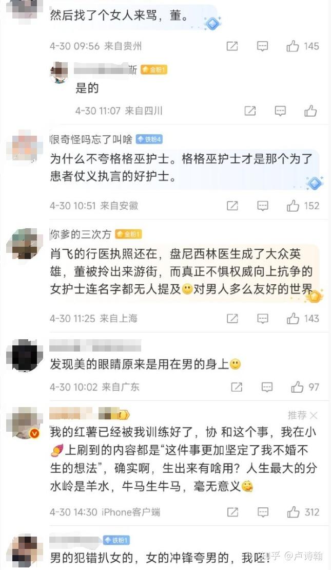 然后到今天,舆论进入性别大战阶段,不少女博主们表示,一个男医生引发的新闻怎么发展到批判女性去了,绝不参与任何一场对女性的围剿。要批判也只许批判新闻里面男医生。