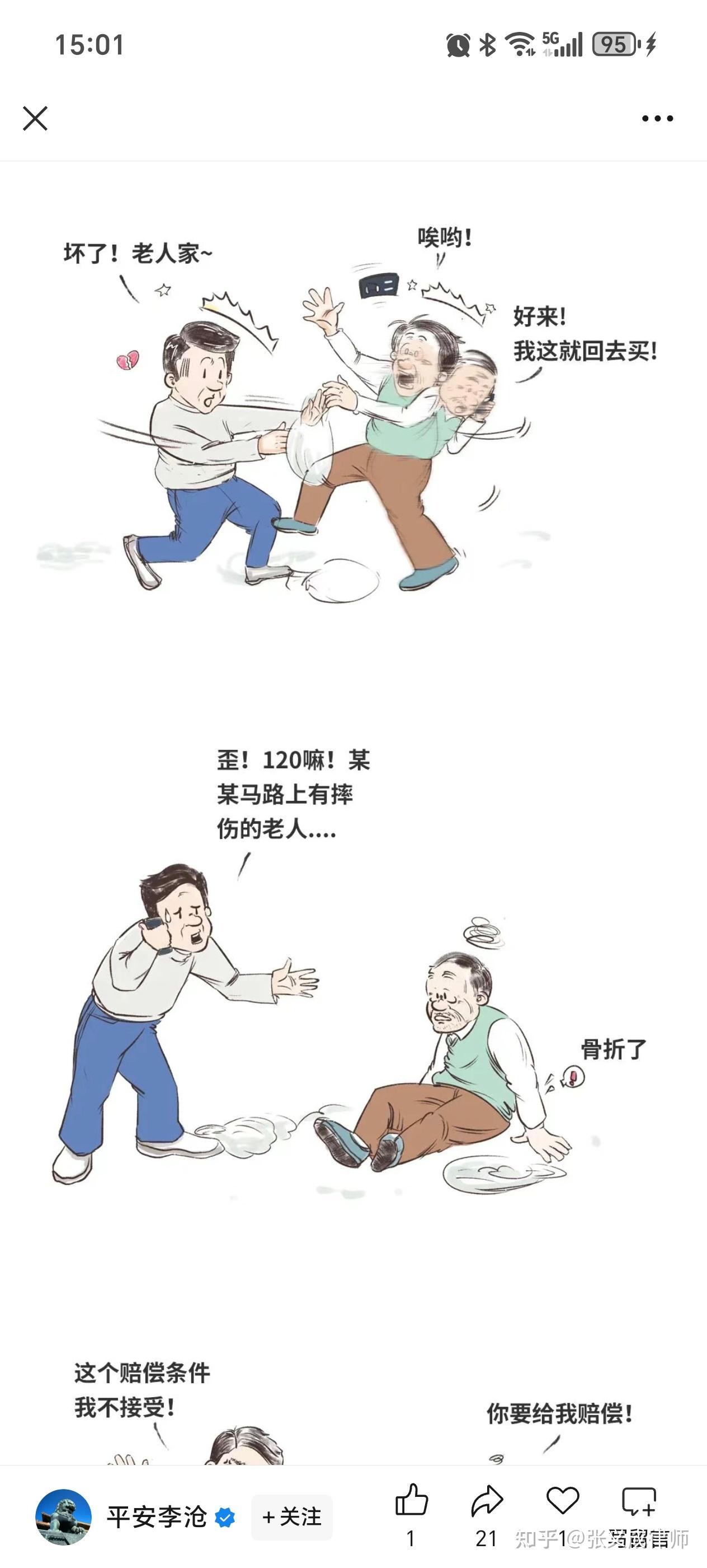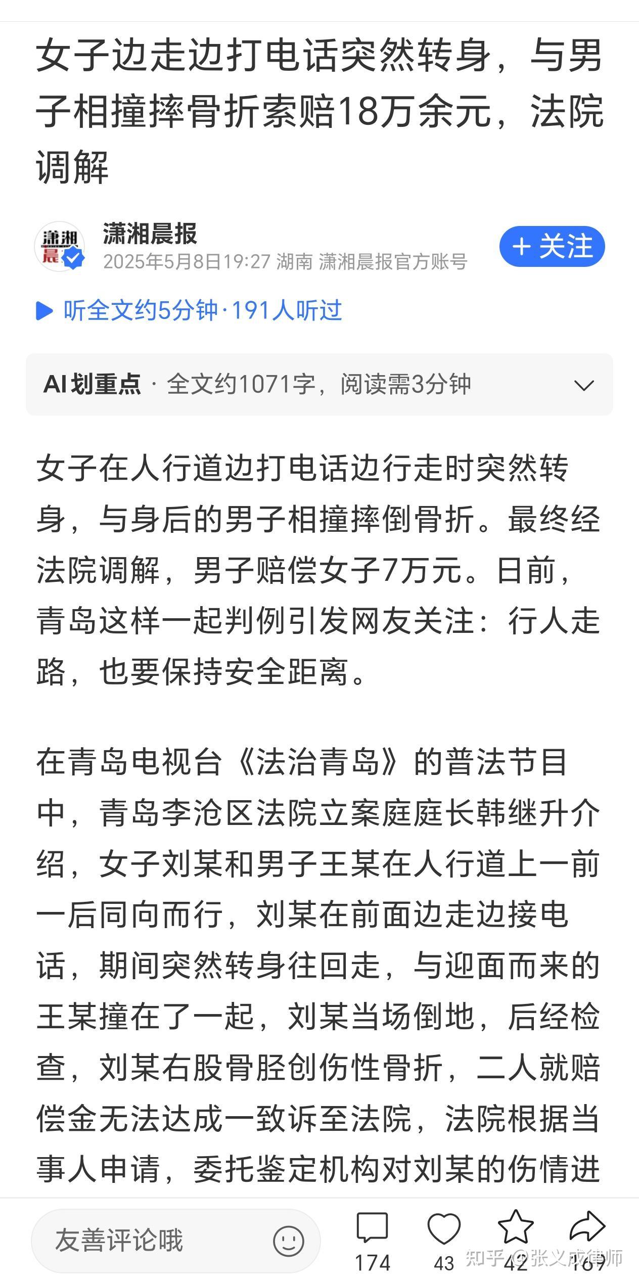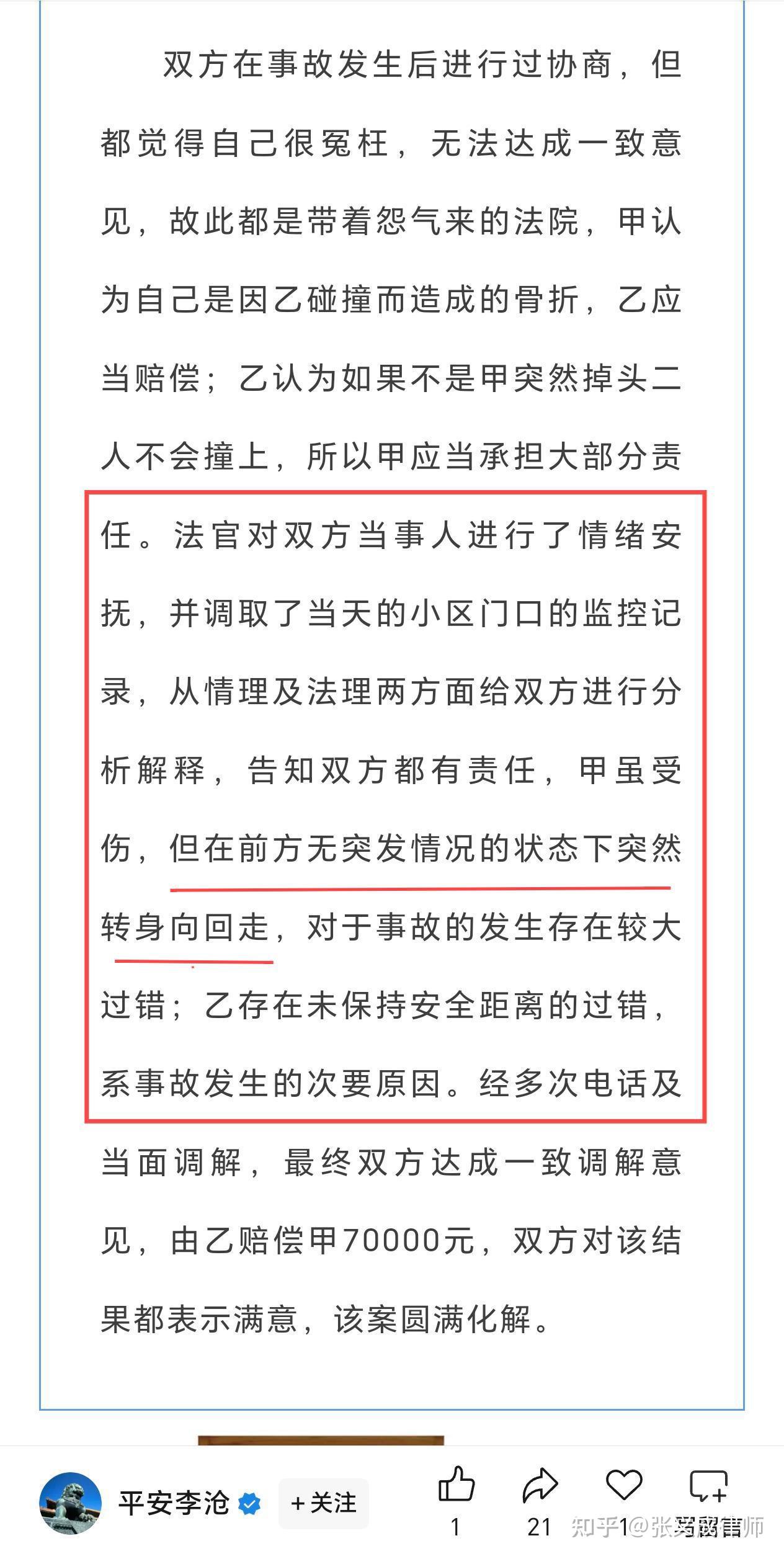 我之前的文章里写的伤者是60岁女性,赔钱的是男性。我产生上述错误认知的直接原因是我在腾信新闻APP上看到潇湘晨报报道里面是这样写的,间接原因是我在平安李沧援引青岛市李沧区人民法院公众号发布的图文中看到文字虽没有指明性别,但文章配图都是男性。经过权衡,我选择了相信所谓的正规媒体潇湘晨报。