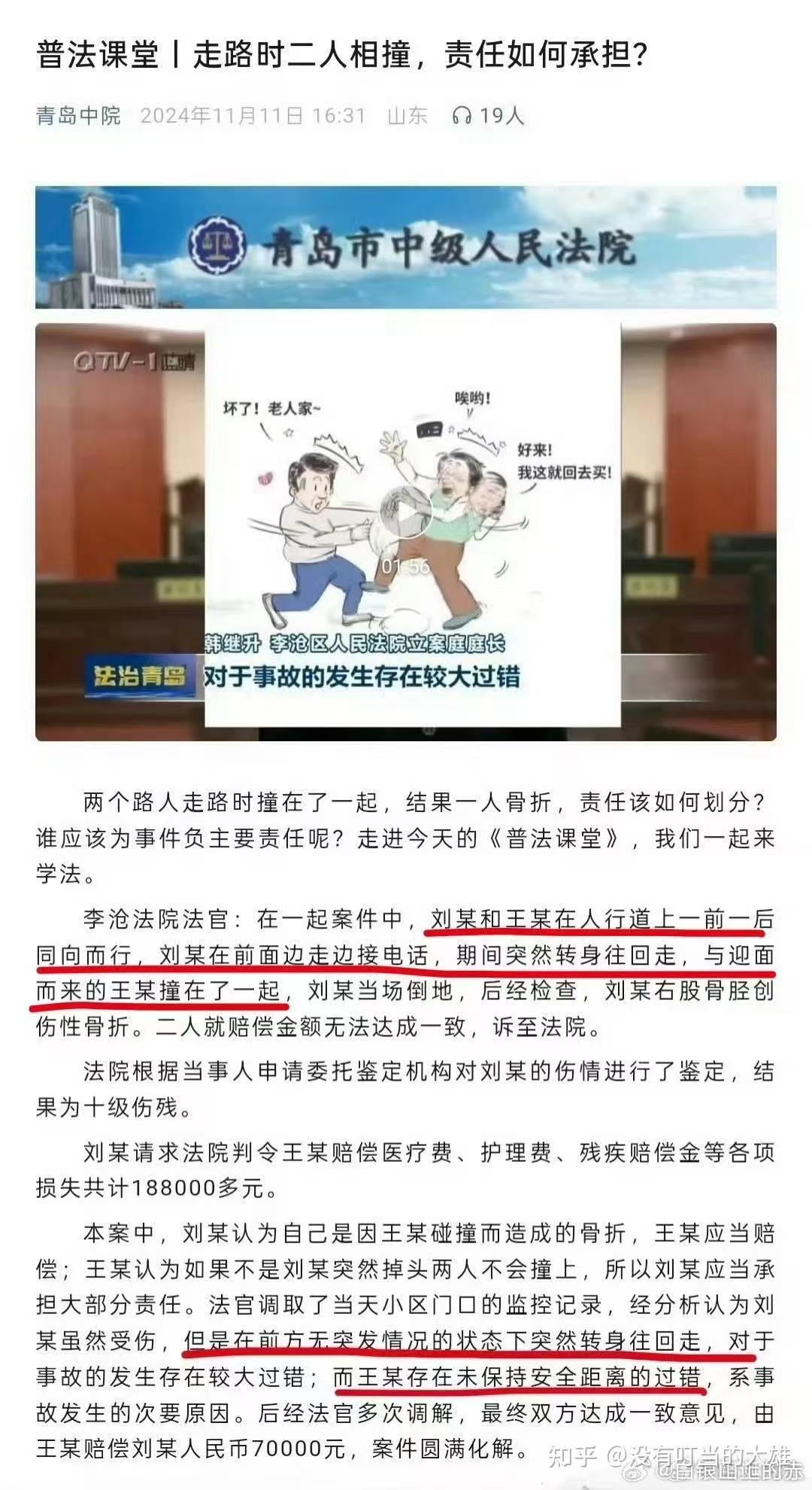 央视法治在线节目播放的监控视频片段(上图)已经说明,之前作者为「青岛中院」的公众号文章(下图,原文目前已被发布者删除),对案件背景的介绍和真实情况存在根本性的偏差:不存在被撞者「突然转身往回走」的情况,被撞者并没有发生位移,另外两者的性别也非公众号文章配图中的组合,而是均为女性。