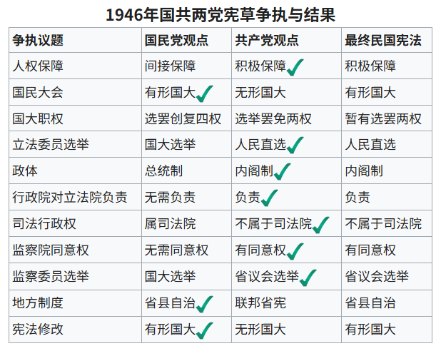 抗战结束后,国共及民盟三方都想重新起一部宪法草案。在这部宪法草案里,各方观点及结果如下