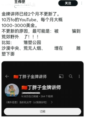 这个王靖渝也是个反贼,而且是最出生的那种,具体不说。总之这人专门诈骗另外一些反华的润人(毕竟深度研究了润人心理学),主要话术就是一套老中特工四处狩猎润人的小故事。
