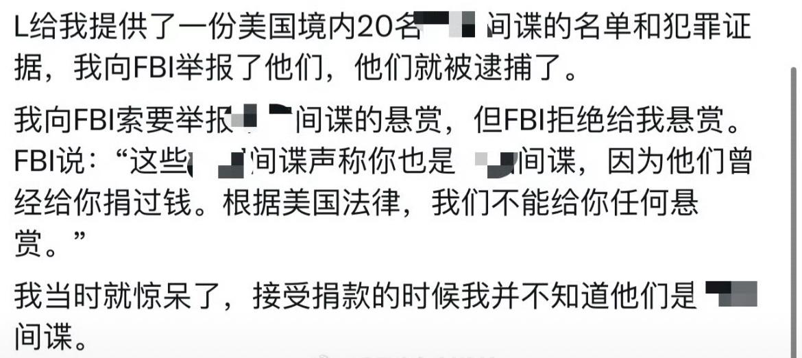 王哥通篇最好玩的是这一段: 这个L交给了王哥一份所谓的“间谍名单”,尽管名单里还有曾给他捐款的人,但为了美帝的千古霸业,我王哥还是毅然决然大义灭亲,把名单交给了FBI。 然后高潮来了,这群被举报的哥们儿反手把王哥也举报了,说他也是间谍,因为他接受了自己这个间谍的捐款。 妈的这群润人太他妈有节目效果了,颇有些珍珠港事件后部分日裔主动配合美国政府调查内味儿,建议川子长按屏幕,快进到忠诚度审查。 发布于 2025-05-27 17:25・四川 赞同 79626 条评论分享 收藏喜欢