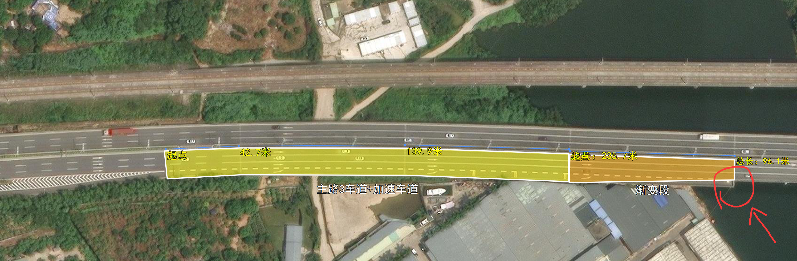 首先来回顾规范。根据《城市快速道路设计规程 CJJ129-2009》,这里采用的平行式加速车道,快速路该段主路限速80,辅路限速40,加速车道(235m,规范160m)和渐变段长度(100m)均满足要求。
