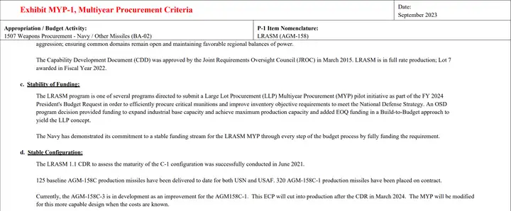 当然,我们可以提前为未来考虑,LRASM去年的采购量是150枚,料敌从宽的情况下,如果每年能照这个速度按时交付,未来会有不小的库存数量。