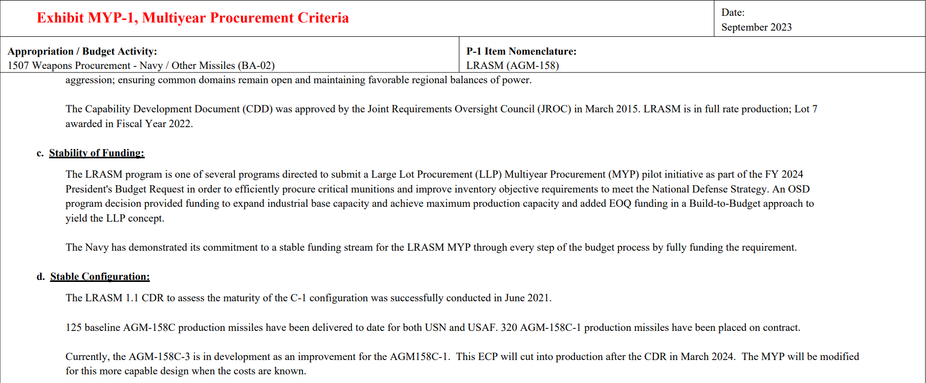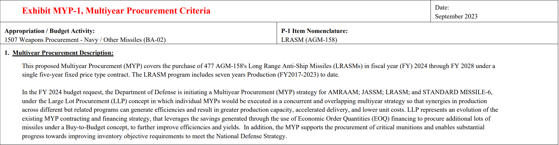 2023 年 9 月美国海军采购文件 —— 125 枚交付、320 枚签订合同、477 枚远期采购,这加起来才 922 枚。而且 477 枚远期采购是 FY2024 至 FY2028 完成,你要凑 1000 枚 LRASM 至少也得等到 2028 年甚至 2030 年吧?
