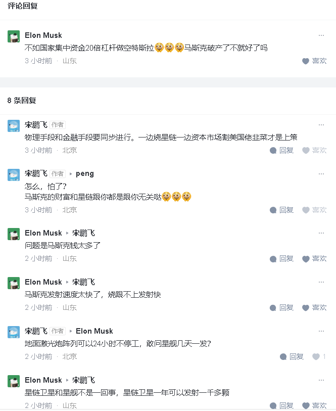 @睡前消息 @工业革命熵不起 SpaceX快让你俩吹死了 要不你俩出点贬低马斯克的节目? 评论区前情提要 非常容易,特别是中国反星链具有几大得天独厚的优势。 你要知道星链是低轨道卫星,除非它跟赤道没有倾角或倾角极小,那么它必然会过顶。 为什么说中国特别有优势,因为青藏高原呀。青藏高原海拔高空气稀薄且晴朗天气特别多,地面上多建一些低成本激光炮阵列,集中火力烧卫星就是了----能源完全不是问题,青藏高原边缘的阶梯水电站直接一根550千伏拉过去,考虑什么功耗? 把激光炮阵列部署到位,每天等着星链过顶烧就是了 编辑于 2025-06-19 19:23・北京 赞同 11825 条评论分享 收藏喜欢 收起