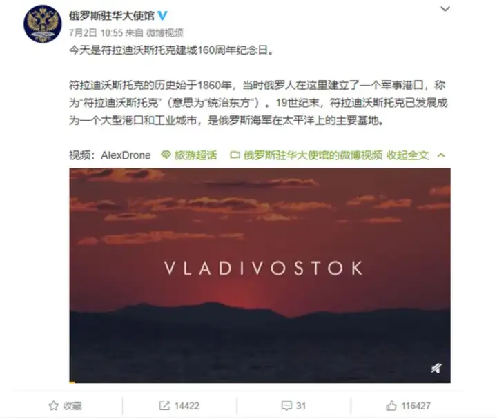 2020年7月2日,俄驻华大使馆高调庆祝《北京条约》签订160周年,暨夺取海参崴纪念日,向14亿中国人民普及“符拉迪沃斯托克”的俄语含义是“统治东方”。