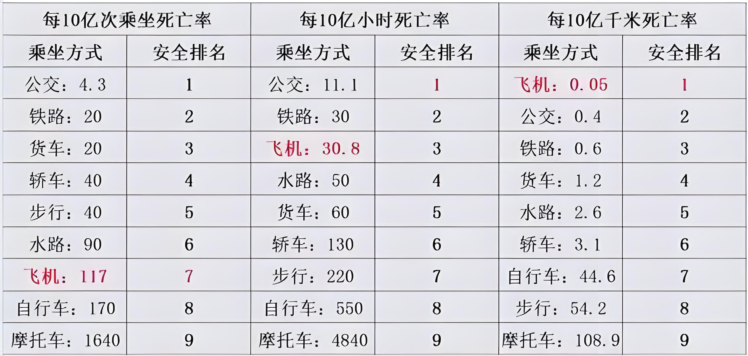 从下面的表格中可以看到,只有以里程数这个指标来评价,飞机是最安全的交通工具。