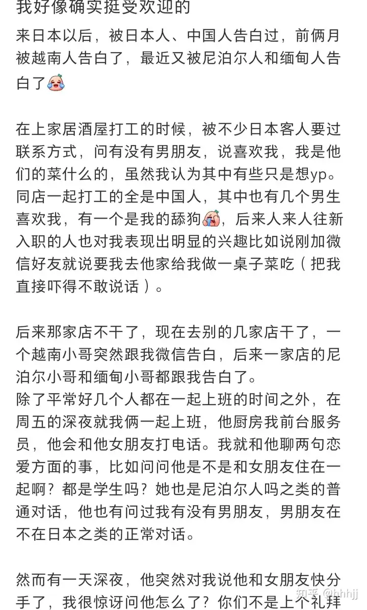 我在小红书刷到一个在日本便利店打工的女生发作品说自己在国内的桃花运啥都没有一来日本短短几个月就被跟她互为同事的越男,日男,中男,巴基斯坦男,柬埔寨男表白了,她还说自己在国内有男朋友下半年才到日本,但是自己和柬埔寨男是同事又不好拒绝他的表白,那个柬埔寨男知道她有男朋友还问她男朋友什么时候来,那个男的还说你男朋友没来有我陪你,经常给她比心,她说出于礼貌自己也回比心给那个男的,评论区另一个日本ip的女生都看不下去了就说“努力提升自己,就不会遇到这些同事骚扰你了”她就破防拉黑别人了,哦对了,她说她发的这些内容她男朋友都知道的,她男朋友经常看她的作品,另外她男朋友貌似就是中国人吧她说过下半年来日本陪她,还说她男朋友知道也没有意见,好像她22年就来日本了吧,2025年了还在日本便利店打工然后评论区同为日本ip的女生意思就是你换个工作吧你这个工作遇到这种男“同事”太正常了,不是你桃花运多旺是你这个工作岗位容易遇到这种人,她貌似就有点不开心了
