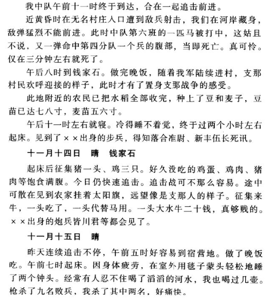 “午后去征集,烧光了支那人家屋十七户。枪杀了乡民。战败国的人真可哀。”放火烧了你的房子,杀了你的人民,然后说你这样的人“真可哀”,这是真可怜吗?实际不过是自居上位者,在嘲讽“失败者”而已。
