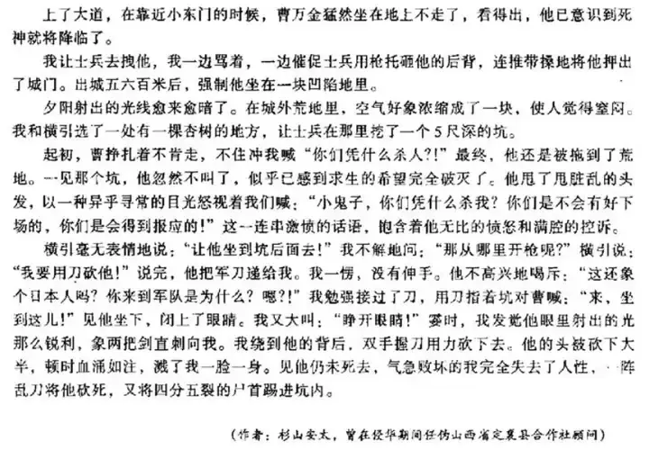 战刀挥下,杉山接着就陷入了惊慌及由之产生的狂乱里,不是为亲手杀人感到慌张,而是因为他技术不精,没能一刀断首,“头砍下大半,顿时血涌如注,溅了我一脸一身”,被飞溅满身血的杉山安泰旋即气急败坏,挥舞起一阵乱刀将八路砍死,而后将尸体踢入坑中。