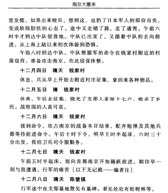 这种心态,在当年参与南京大屠杀的日军官兵日记里就有记录:山炮兵19联队3大队的伍长目黑福治的战地日记里就写到过,1937年11月15日时他从昨日到今天只睡了两个小时,疲惫不堪,最后解压是靠的什么?枪杀俘虏,杀中国人就是他的解压方法。