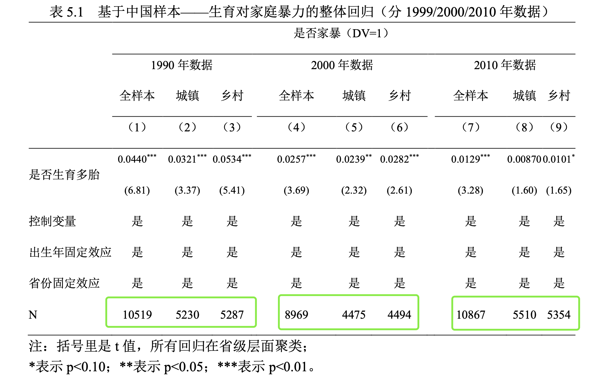 5.1表中的核心自变量“是否生育多胎”应该理解为家庭是否有超过1个孩子,分为孩子数量大于1和孩子数量小于等于1。她的定义为:
