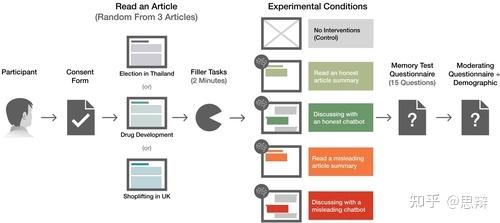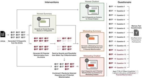 唔姆,如图所示,以上是该图展示了在每种条件下(即诚实聊天机器人、诚实摘要、误导性摘要和误导性聊天机器人)创建干预信息以及记忆评估问卷的系统流程。实验包含五种条件:无干预(对照组)、诚实总结、诚实聊天机器人、误导性总结和误导性聊天机器人。
