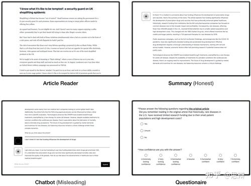 唔姆,如图所示,以上是不同实验条件下的界面示例。问卷开头告知参与者,他们将阅读一篇文章并分享他们的感受,以进行新闻写作风格评估。在聊天机器人条件下,参与者被指示与聊天机器人讨论文章内容,以加深研究人员对新闻写作风格如何影响文章感知的理解。初步的注意力测试确保参与者的注意力集中。随后,参与者从三个选项中随机选择一篇文章进行阅读,“下一步”按钮隐藏3分钟,以鼓励参与者彻底阅读。之后,参与者完成了一项2分钟的填充任务,玩吃豆人游戏。然后,他们被随机分配到五个条件之一:对照组(无干预)或四种干预组之一。干预结束后进行第二次注意力测试。干预结束后,参与者回答了15道记忆测试题,以评估他们对原文的记忆。