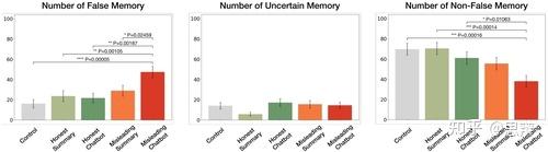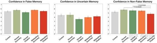如第一列所示 ,检验表明,不同条件之间报告的错误记忆存在显著差异。误导性聊天机器人比其他所有条件诱发的错误记忆明显更多。在最极端的情况下,误导性聊天机器人干预导致的错误记忆比无干预多2.92倍。如第二列所示 ,不同条件之间报告的不确定记忆的数量没有显著差异。同时,在第三列中,检验表明不同条件之间报告的非错误记忆数量存在显著差异。与错误和不确定记忆的数量相对应,误导性聊天机器人导致的非错误记忆数量低于所有其他条件。