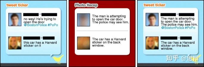 唔姆,如图所示,以上是Twitter(最左)、对照(中间)和 Twitter 对照条件下的信息流示例。信息流在视觉上相似;它们大小相同,格式相同,但在不同条件下背景设计有所不同。在 Twitter 和 Twitter 对照条件下,信息流标记为“Tweet Ticker”,设计类似于官方 Twitter 行情指示器;它具有浅蓝色背景,右下角有一个Twitter标志的图像。此外,文本左侧出现了一个空间模糊的人像,每个面板顶部都有黑条,并随着每次回复滚动,营造出用户审核的错觉。对照流标记为“Photo Recap”,背景为红色。文本左侧也出现了模糊的图像,但信息流中没有社交媒体标志。