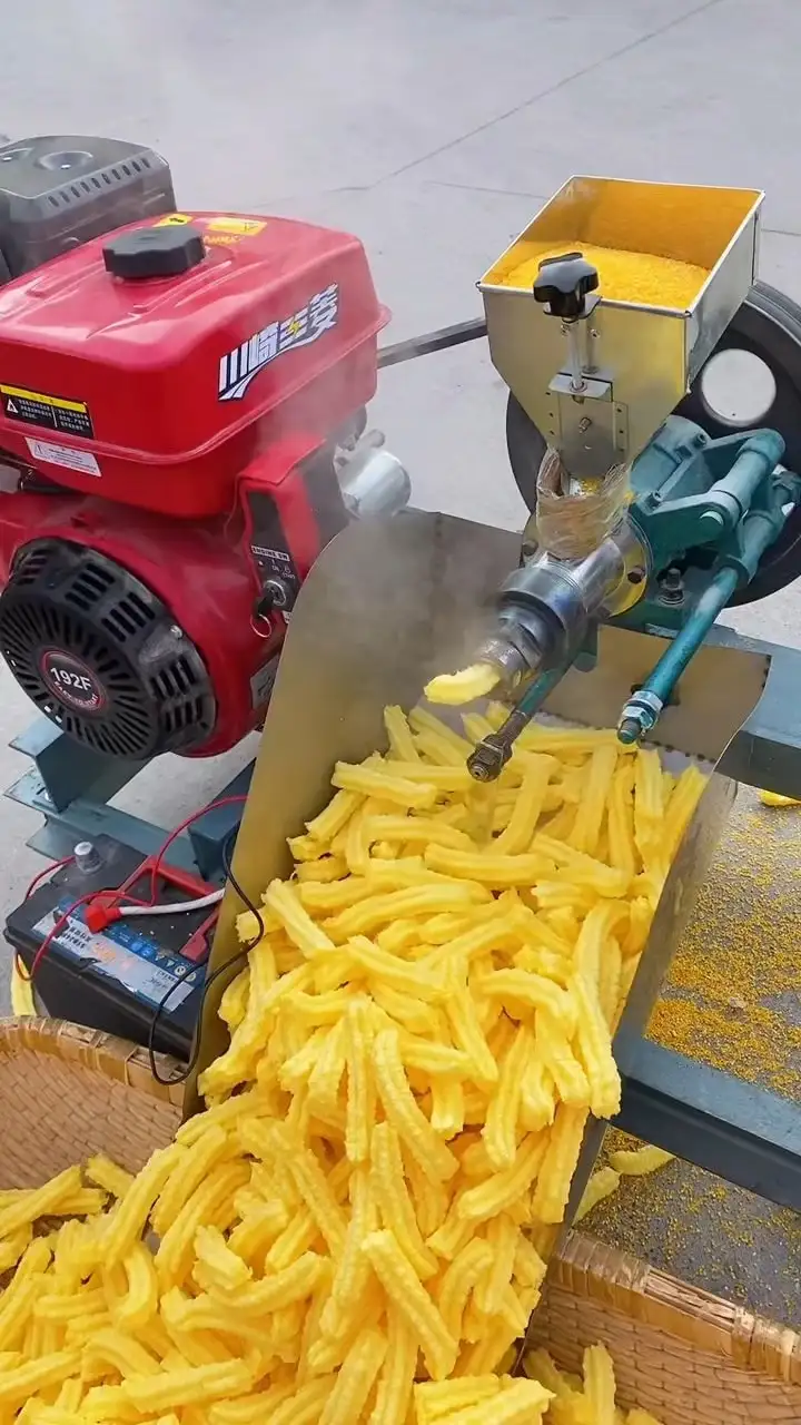 大集上用玉米做膨化条那机器就是,不过大集上的多数是单螺杆挤压机。