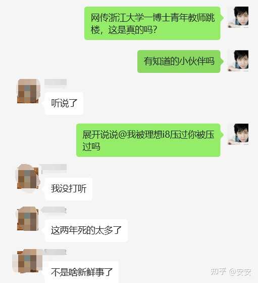 官方都没发通告,也就小红书有点爆料。说是位2020年入职食品工程学院的青椒。没有海外背景,浙工大的本科,浙大的硕博,据说有青年面上基金,但有可能上不了青B(我理解的是优青)。至于跳楼原因,有的说是因为考核压力大,又有的说是感情和家庭问题。以上是吃瓜简述,这不是浙大第一例青椒跳楼的案例了,而近两年猝死/自杀的青椒更加数不胜数。